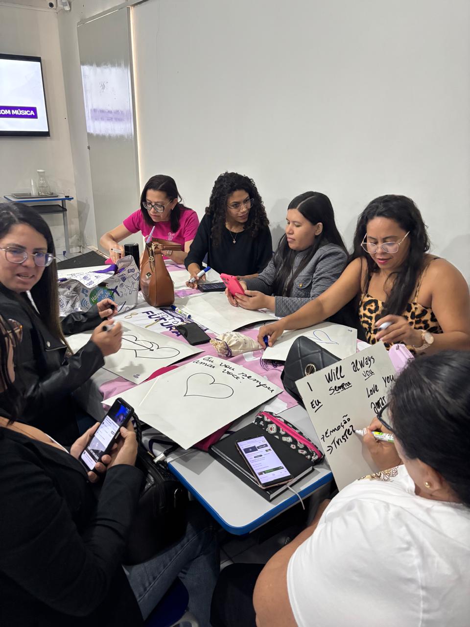 Dito isso, os professores participaram de uma atividade em grupos, a qual retiravam aleatoriamente duas cartelas contendo o nome de músicas. Cada grupo pesquisou a tradução das letras e, posteriormente, expressou artisticamente no quadro como a música impacta emocionalmente as pessoas. Essa atividade estimulou a criatividade e a interpretação pessoal das obras musicais.
